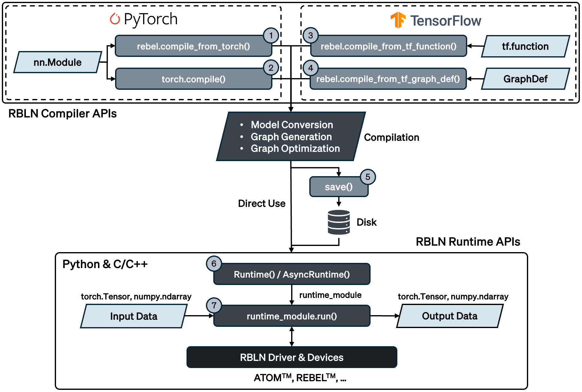 The RBLN Compiler can directly compile the graph representations of PyTorch and TensorFlow, specifically ① and ② torch.nn.Module for PyTorch and ③ tf.function for TensorFlow_v2, ④ GraphDef for TensorFlow_v1.