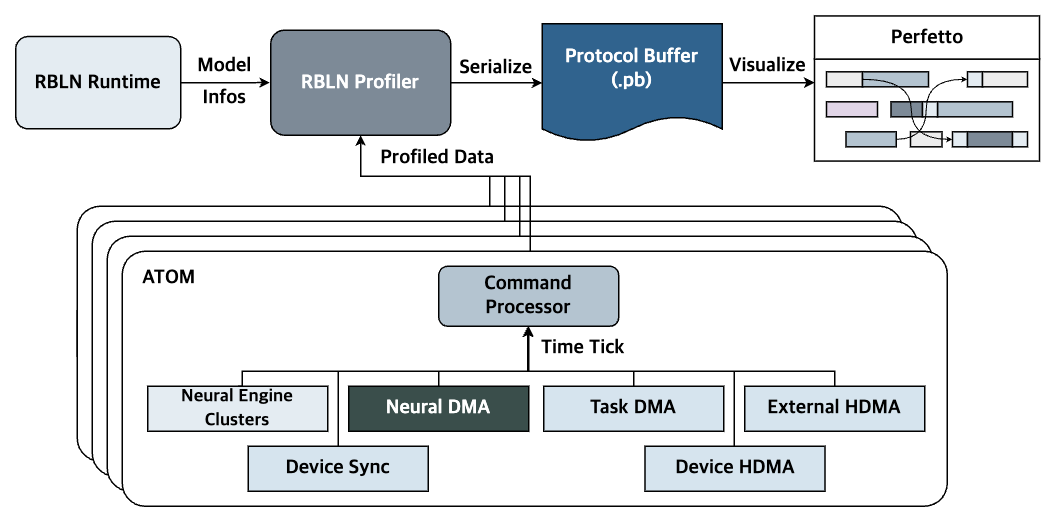 - RBLN Profiler processes and breaks down the profiling data from the RBLN NPUs, then serializes it into a Protocol Buffer (.pb) format for analysis and visualization.