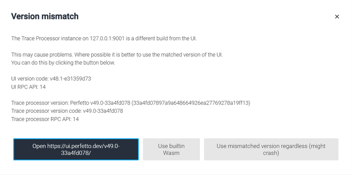 • Web Perfetto detects version mismatch with the local tracer. Click “Open https://ui.perfetto.dev/v49.0-33a4fd078/” to access the hosted local tracer.