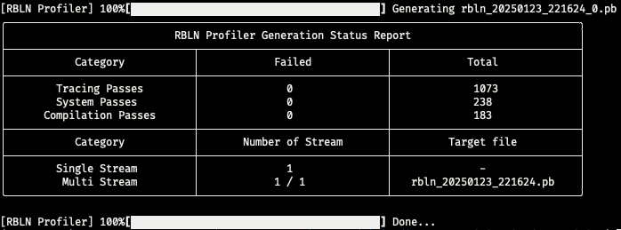RBLN Profiler Generation Status Report shows all status information generated during the tracing and generation process of the RBLN profiler, displayed across three categories.