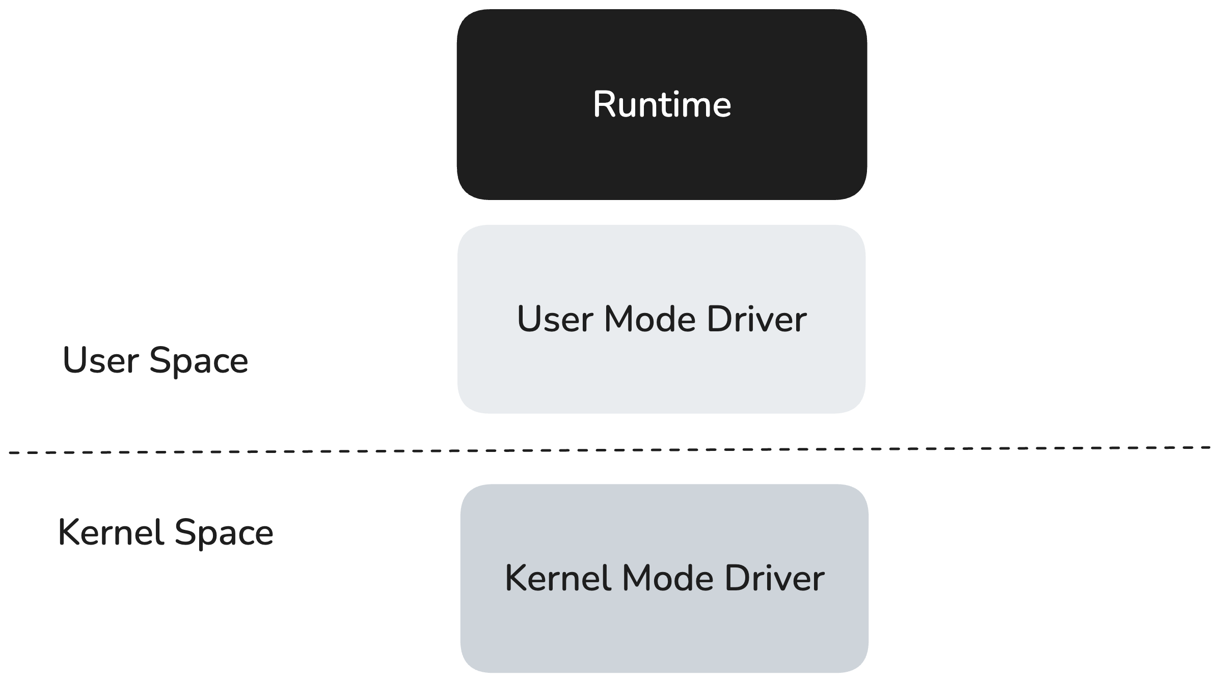 The RBLN runtime operates in the user space, running on top of the user-mode driver (UMD) and utilizing its low-level interface to communicate with the kernel-mode driver (KMD). The KMD runs in the operating system's kernel, where it handles privileged operations such as direct hardware access and scheduling.