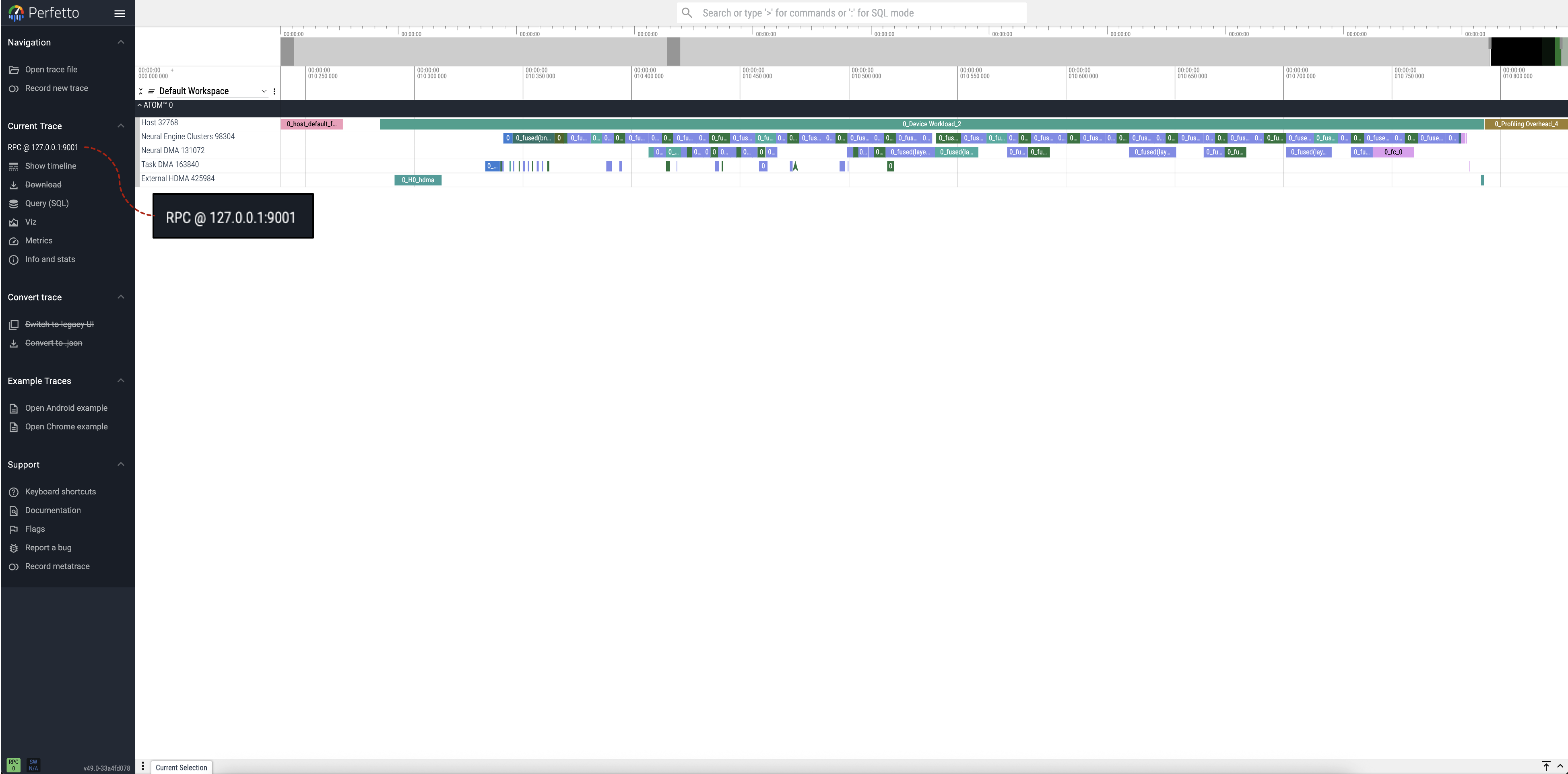 You can confirm that the local tracer is successfully visualized through the display "RPC@127.0.0.1:9001" or “rbln_xxxx.pb (file 1)” on the left.