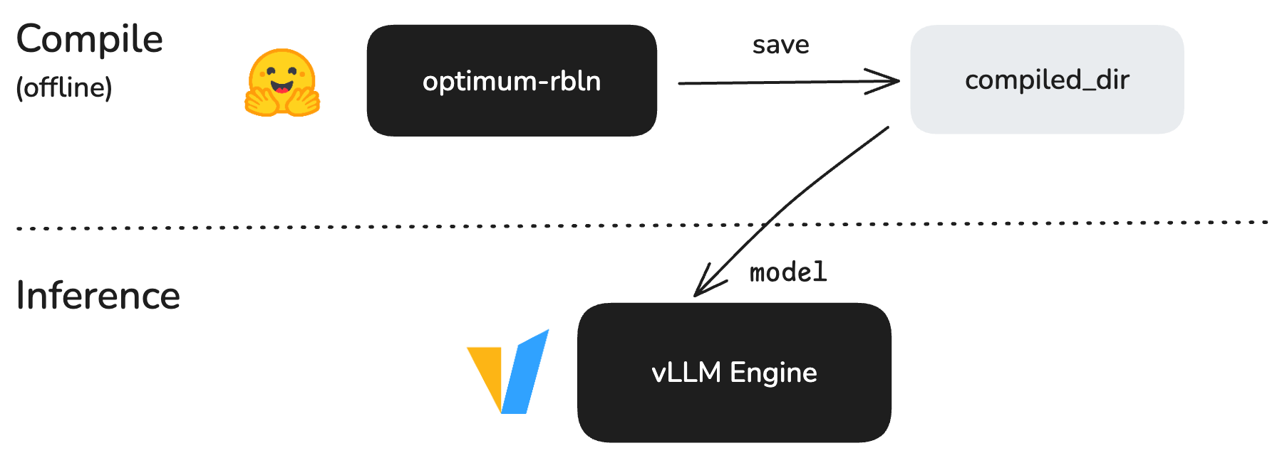 The initial design of vLLM RBLN integrates with optimum-rbln. In this setup, models are first compiled using optimum-rbln, and the resulting compiled model directory is then used by vLLM via the model parameter. This remains the default implementation for now, offering a stable and proven workflow while a new architecture is under active development.